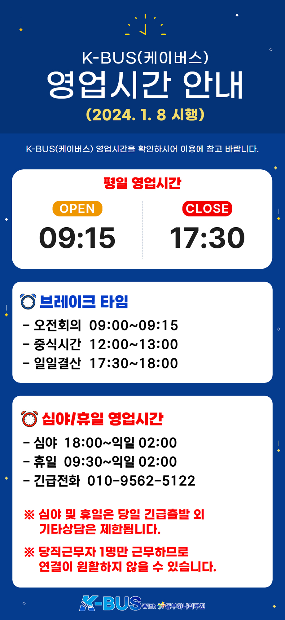 ![]() 기분 좋은 여행의 시작~ K-BUS(케이버스)에서 영업시간을 안내해 드리오니 이용에 참고 바랍니다. ■ 평일 영업시간 ■ 09:15~17:30 ■ 브레이크타임 ■ 오전회의 09:00~09:15 중식시간 12:00~13:00 일일결산 17:30~18:00 ■ 심야/휴일 영업시간 ■ 심야 18:00~익일 02:00 휴일 09:30~익일 02:00 긴급전화 010-9562-5122 ※ 심야 및 휴일은 당일 긴급 출발 외 기타상담은 제한됩니다. ※ 당직근무자 1명만 근무하므로 연결이 원활하지 않을 수 있습니다. (시행일 2024. 1. 8)