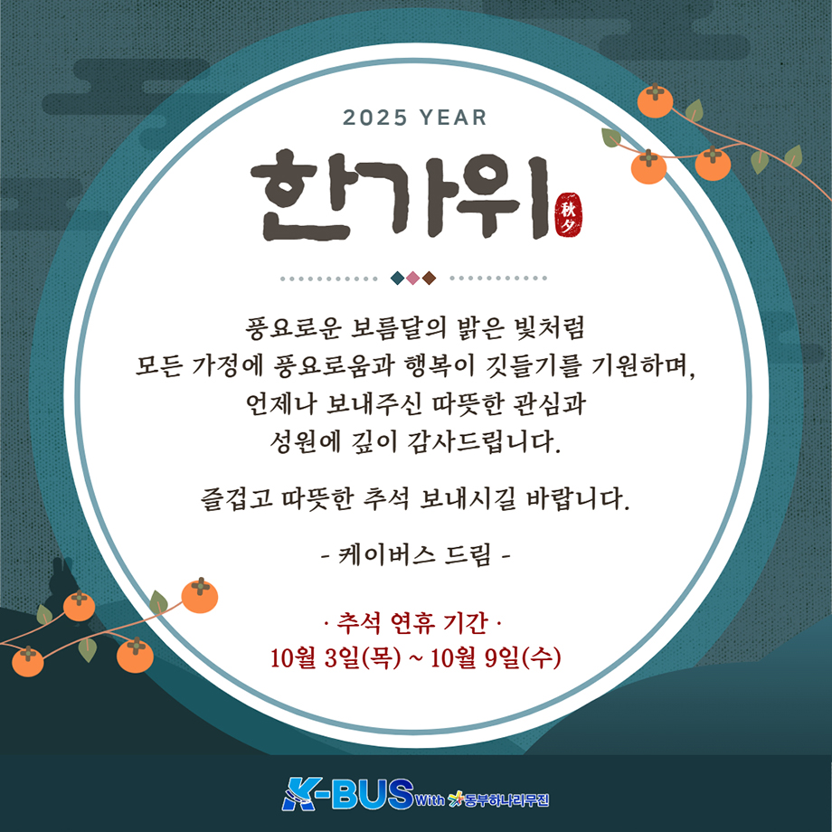 안녕하세요. 기분 좋은 여행의 시작~! K-BUS 입니다. 풍요로운 보름달의 밝은 빛처럼 모든 가정에 풍요로움과 행복이 깃들기를 기원하며, 언제나 보내주신 따뜻한 관심과 성원에 깊이 감사드립니다. 즐겁고 따뜻한 추석 보내시길 바랍니다. - K-BUS 드림 -
