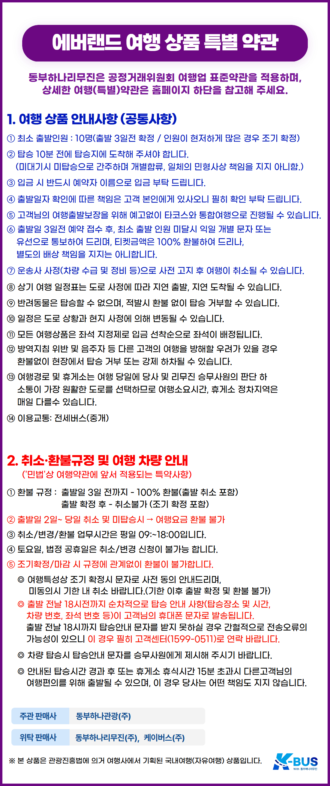 | ·포함내역 | 버스 여행권, 기사님 봉사료, 개인별 생수 (1병) 차량 보험, 여행업 보증보험 |