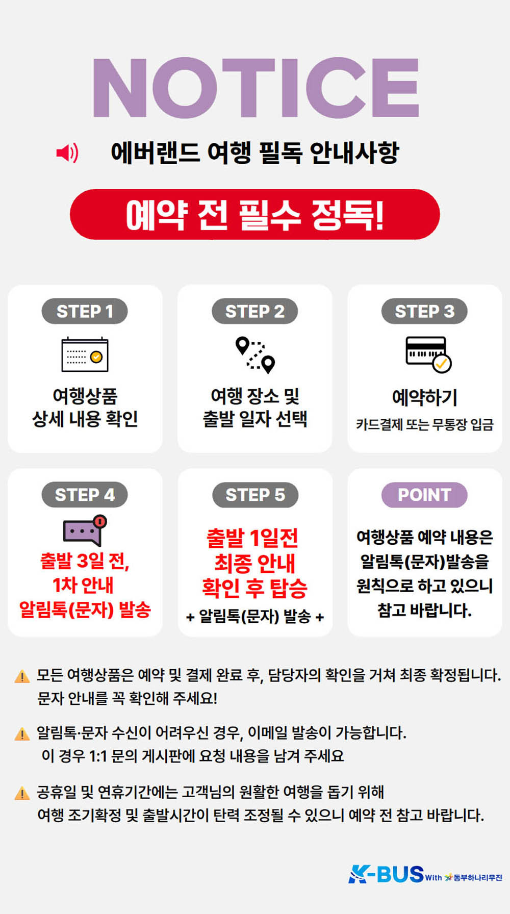 | ·포함내역 | 버스 여행권, 기사님 봉사료, 개인별 생수 (1병) 차량 보험, 여행업 보증보험 |