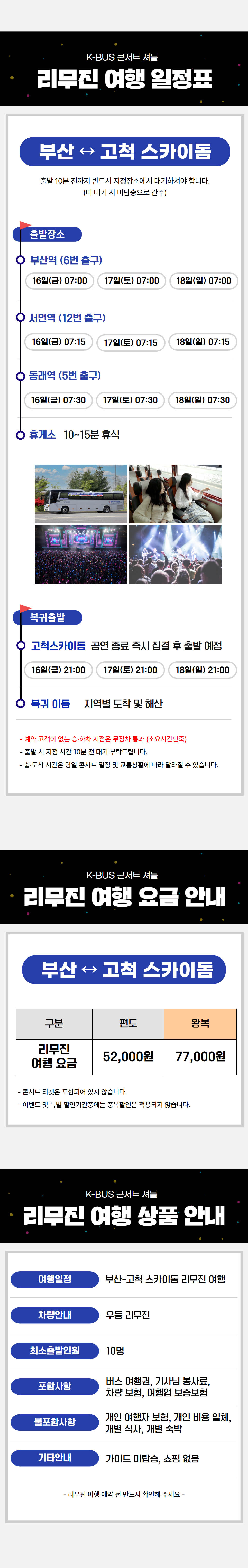 | ·불포함내역 | 팬미팅입장권, 개인 여행자 보험, 개인 비용 일체 개별 식사, 개별 숙박, 가이드 미탑승, 쇼핑없음 |