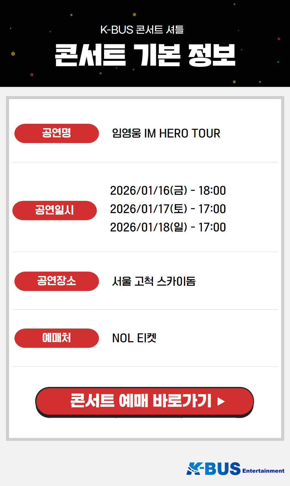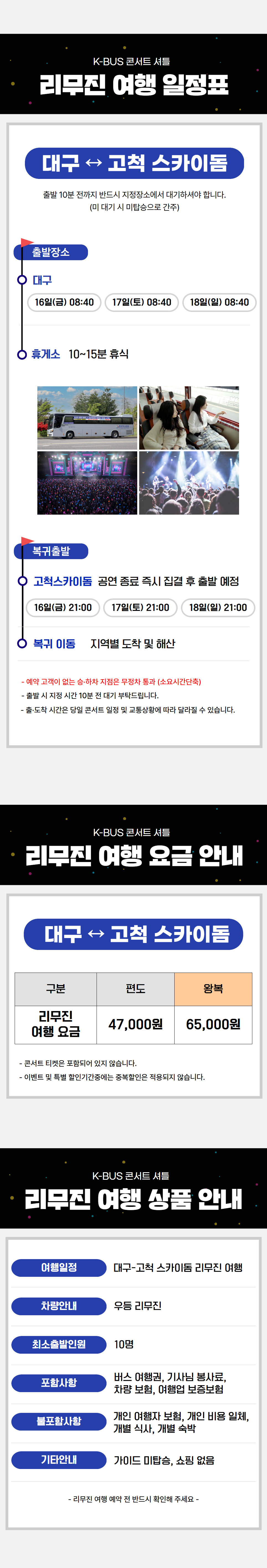 | ·불포함내역 | 콘서트입장권, 개인 여행자 보험, 개인 비용 일체 개별 식사, 개별 숙박, 가이드 미탑승, 쇼핑없음 |