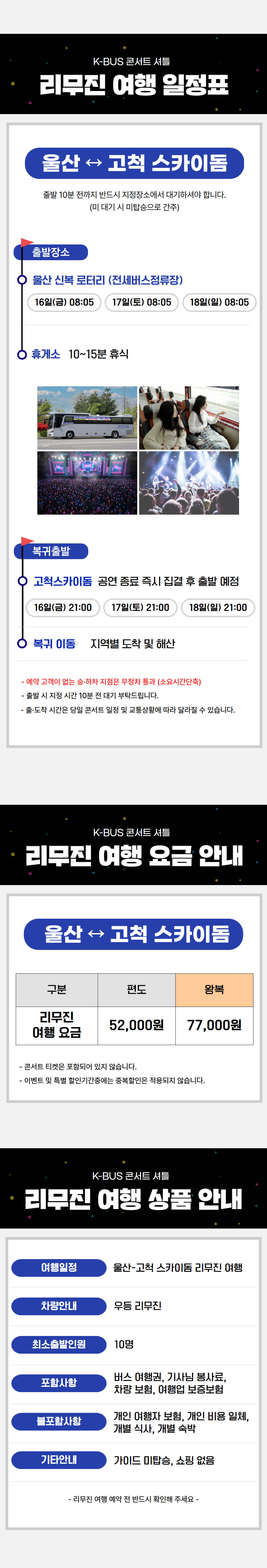 | ·불포함내역 | 콘서트입장권, 개인 여행자 보험, 개인 비용 일체 개별 식사, 개별 숙박, 가이드 미탑승, 쇼핑없음 |