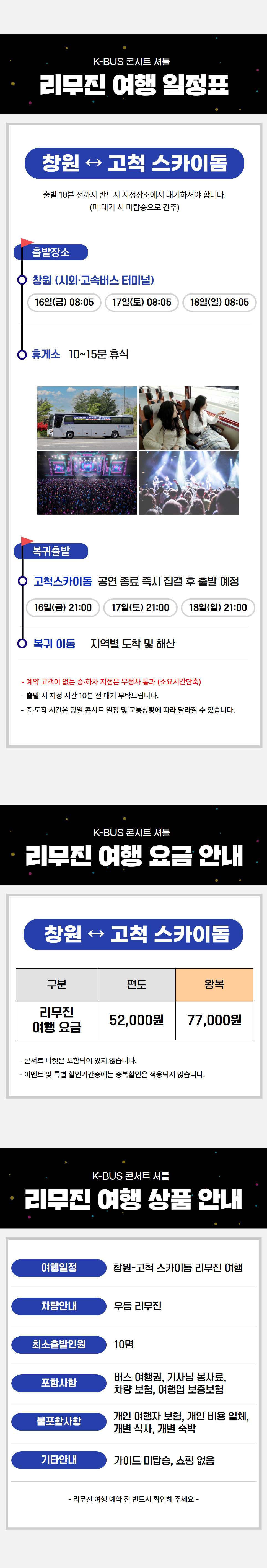 | ·불포함내역 | 콘서트입장권, 개인 여행자 보험, 개인 비용 일체 개별 식사, 개별 숙박, 가이드 미탑승, 쇼핑없음 |