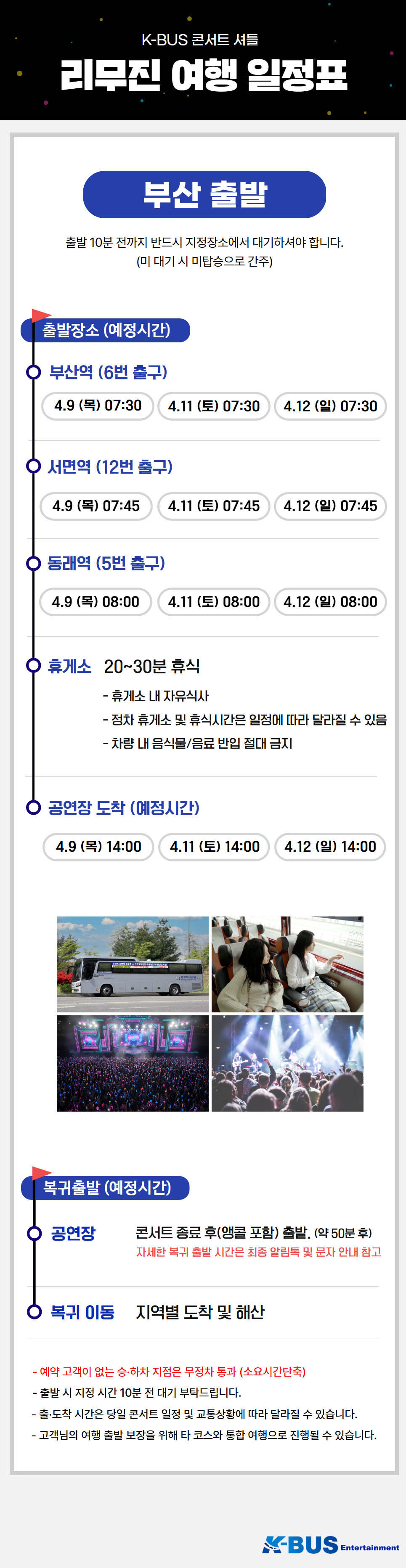 | ·불포함내역 | 콘서트 입장권, 개인 여행자 보험, 개인 비용 일체, 개별 식사, 개별 숙박, 가이드 미탑승, 쇼핑없음 |