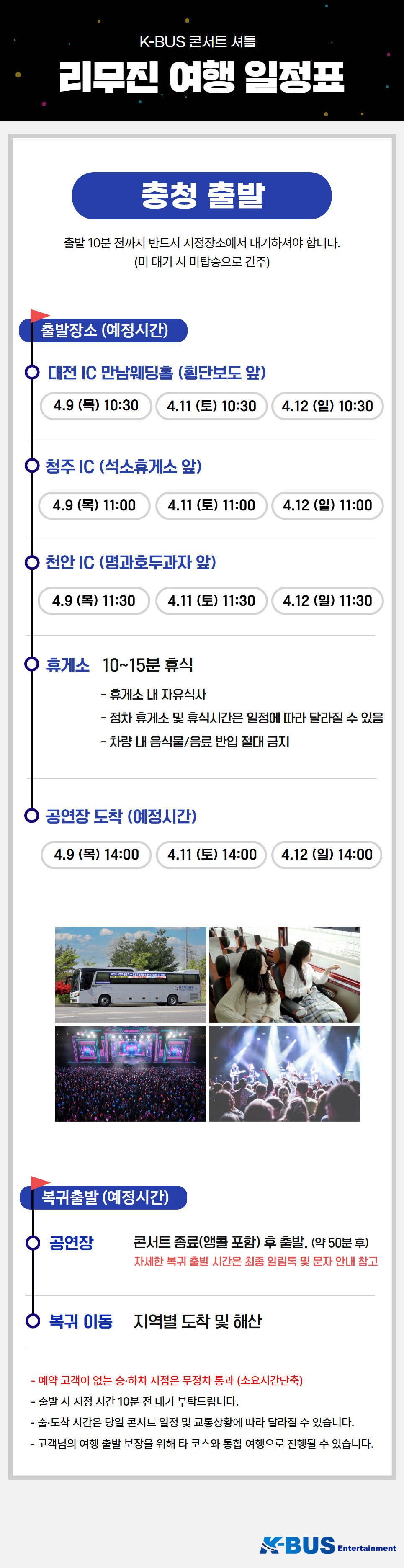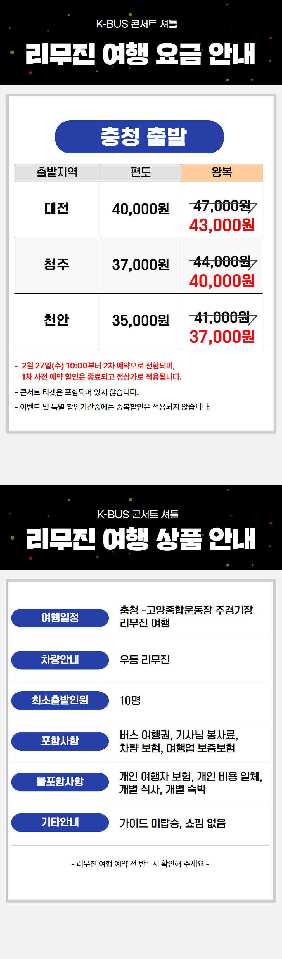 | ·불포함내역 | 콘서트 입장권, 개인 여행자 보험, 개인 비용 일체, 개별 식사, 개별 숙박, 가이드 미탑승, 쇼핑없음 |