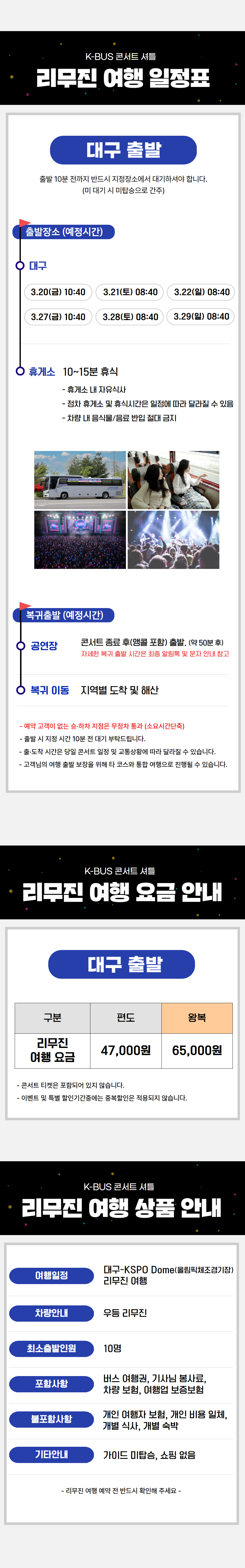 | ·불포함내역 | 콘서트입장권, 개인 여행자 보험, 개인 비용 일체 개별 식사, 개별 숙박, 가이드 미탑승, 쇼핑없음 |