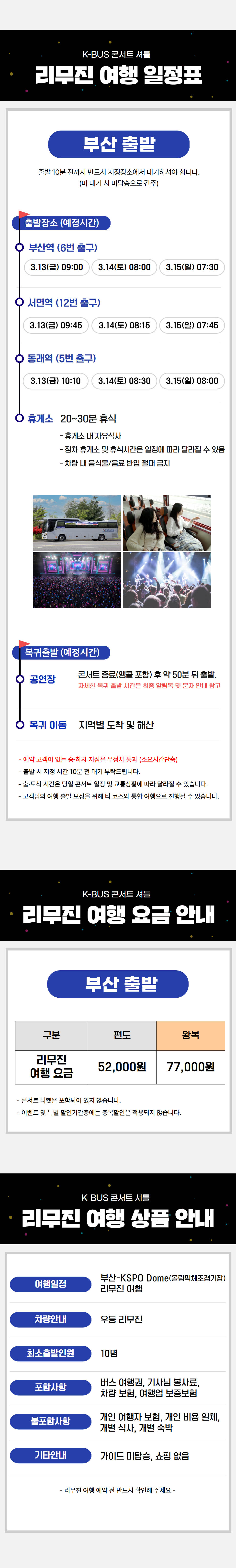 | ·불포함내역 | 콘서트 입장권, 개인 여행자 보험, 개인 비용 일체 개별 식사, 개별 숙박, 가이드 미탑승, 쇼핑없음 |