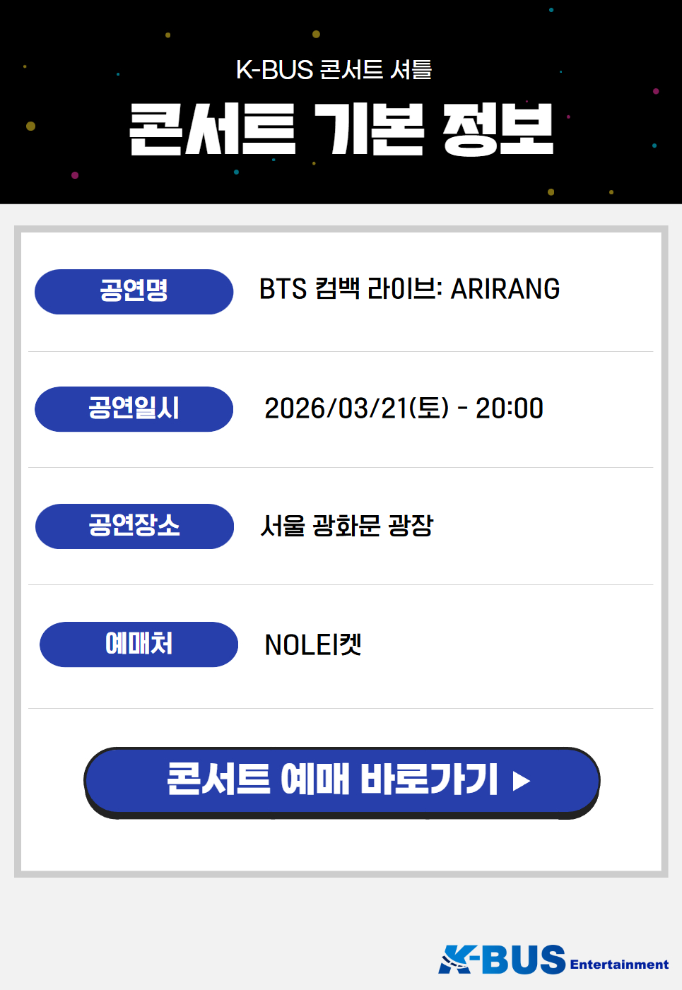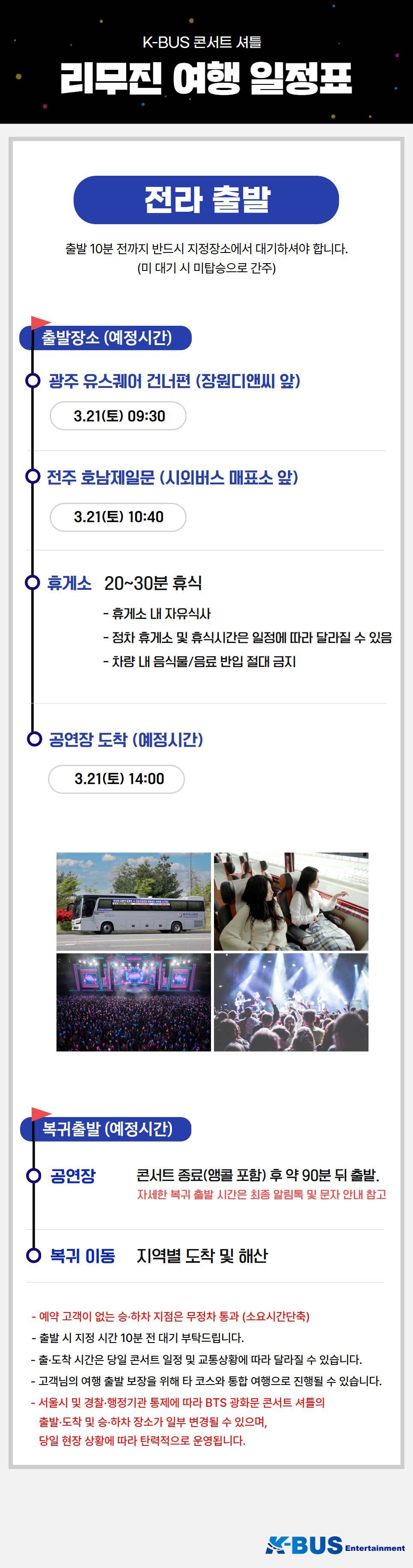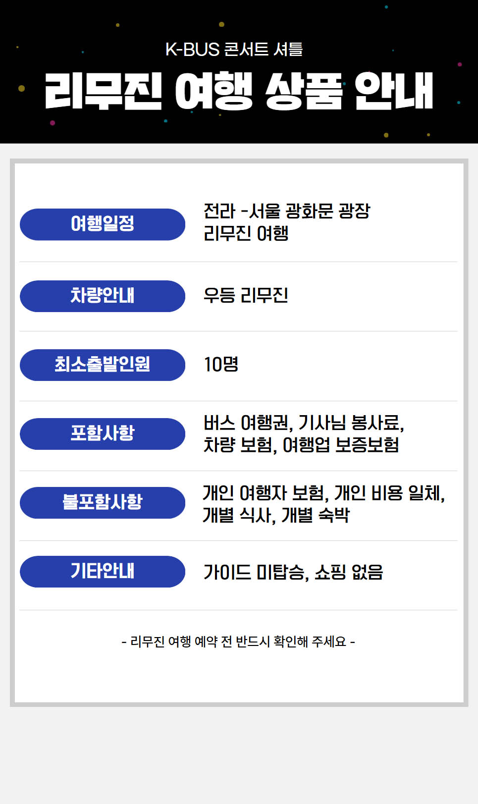| ·불포함내역 | 콘서트 입장권, 개인 여행자 보험, 개인 비용 일체, 개별 식사, 개별 숙박, 가이드 미탑승, 쇼핑없음 |