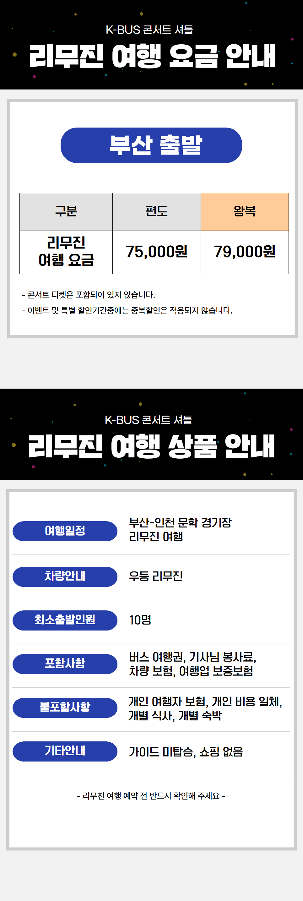·불포함내역 콘서트 입장권, 개인 여행자 보험, 개인 비용  일체, 개별 식사, 개별 숙박, 가이드 미탑승, 쇼핑없음