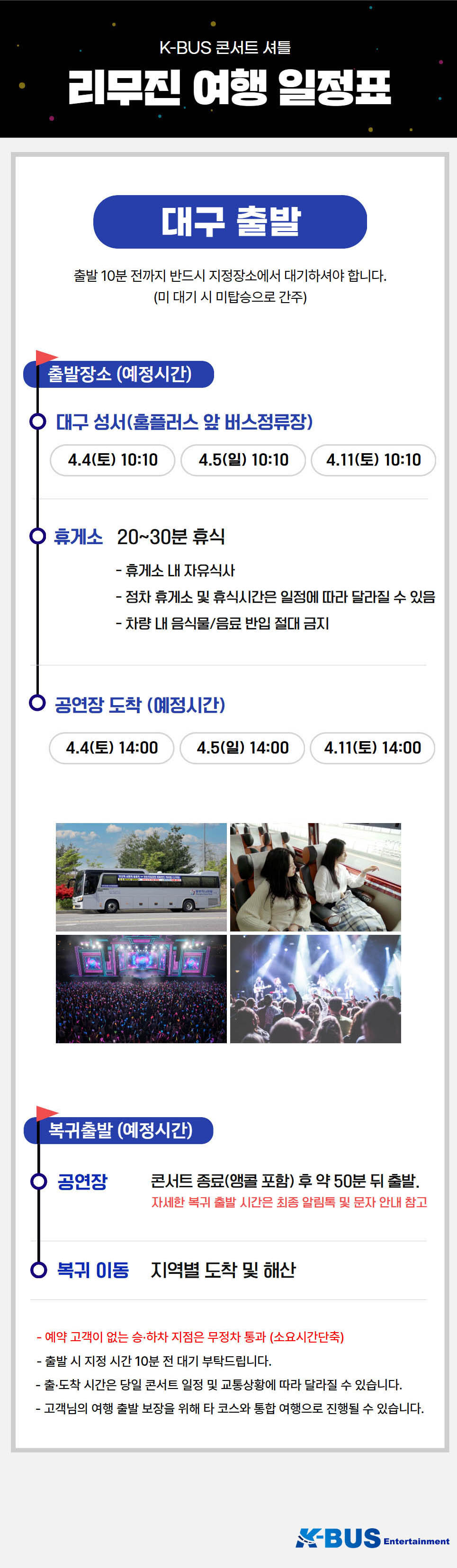 | ·불포함내역 | 콘서트 입장권, 개인 여행자 보험, 개인 비용 일체, 개별 식사, 개별 숙박, 가이드 미탑승, 쇼핑없음 |