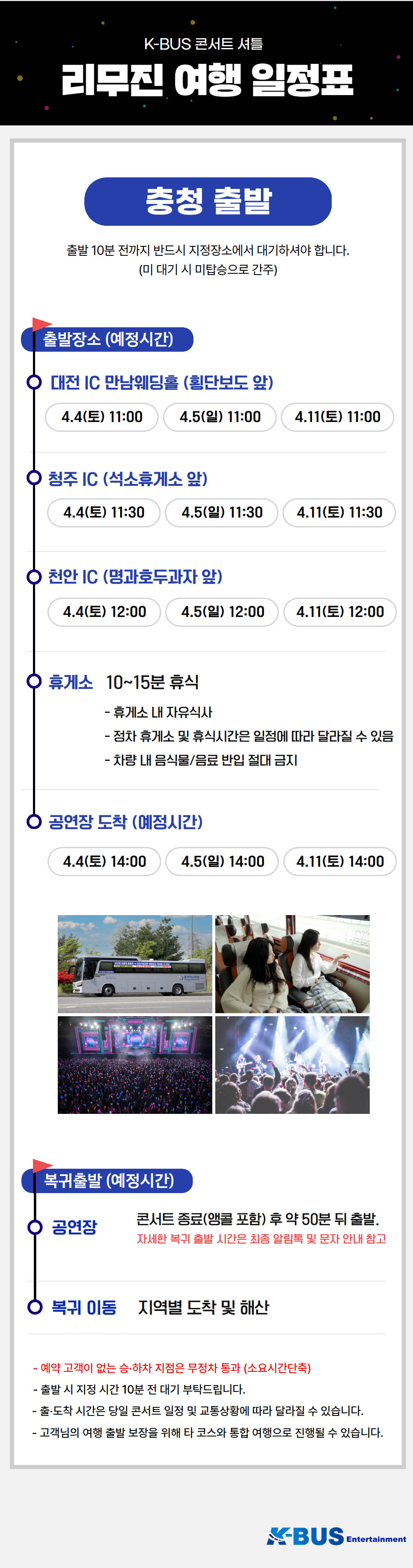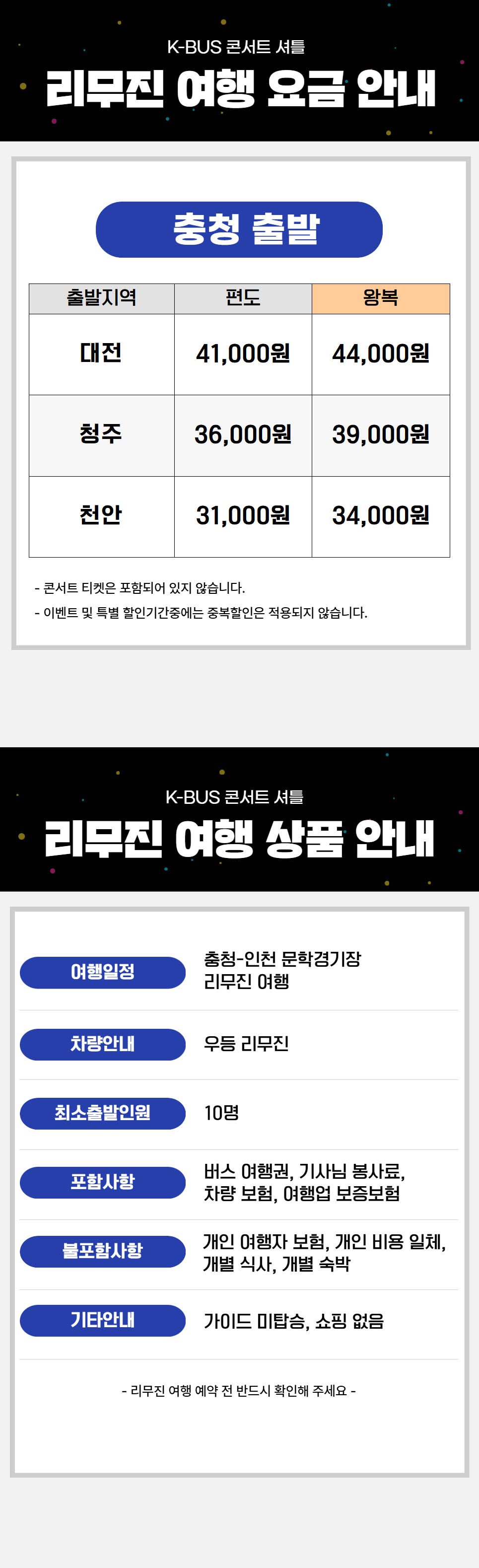 | ·불포함내역 | 콘서트 입장권, 개인 여행자 보험, 개인 비용 일체, 개별 식사, 개별 숙박, 가이드 미탑승, 쇼핑없음 |