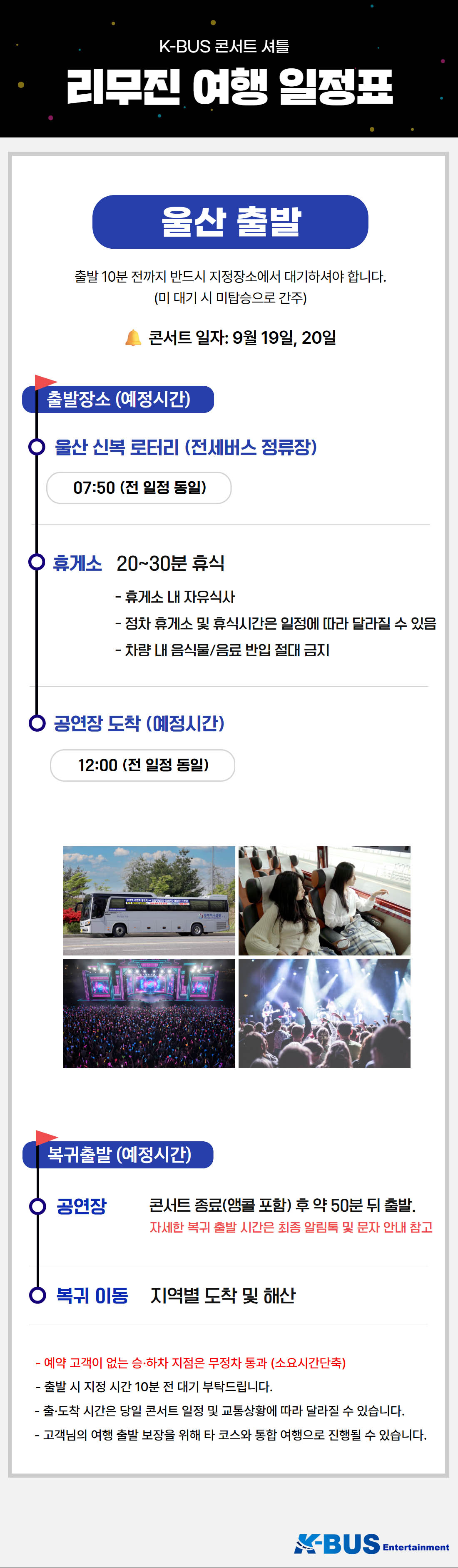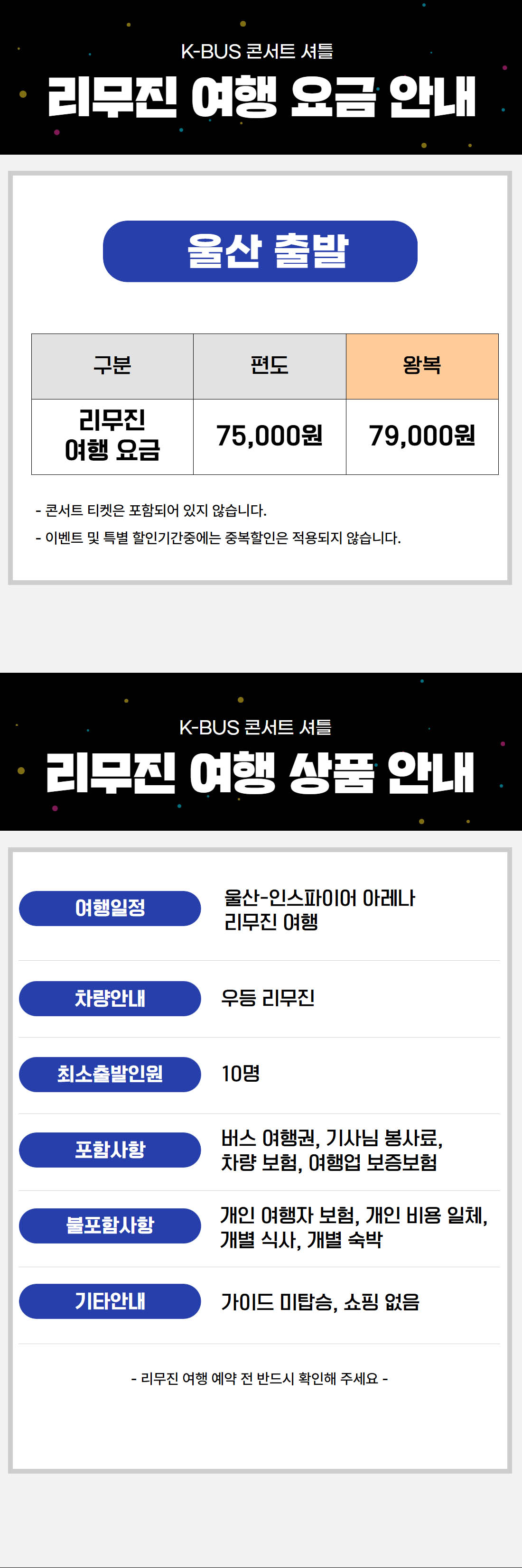 | ·불포함내역 | 콘서트 입장권, 개인 여행자 보험, 개인 비용 일체, 개별 식사, 개별 숙박, 가이드 미탑승, 쇼핑없음 |