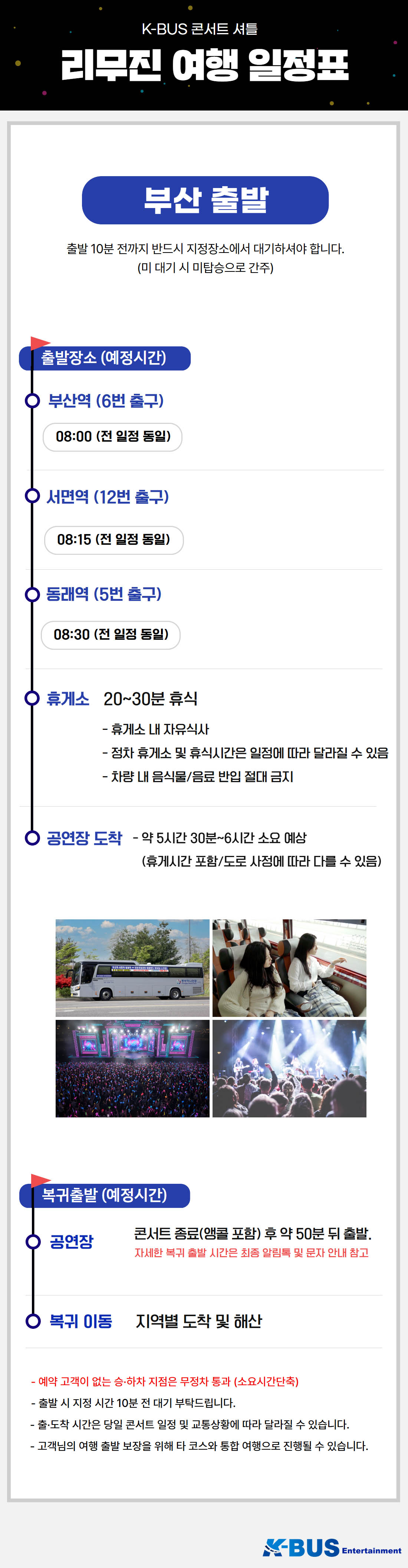 | ·불포함내역 | 콘서트 입장권, 개인 여행자 보험, 개인 비용 일체, 개별 식사, 개별 숙박, 가이드 미탑승, 쇼핑없음 |