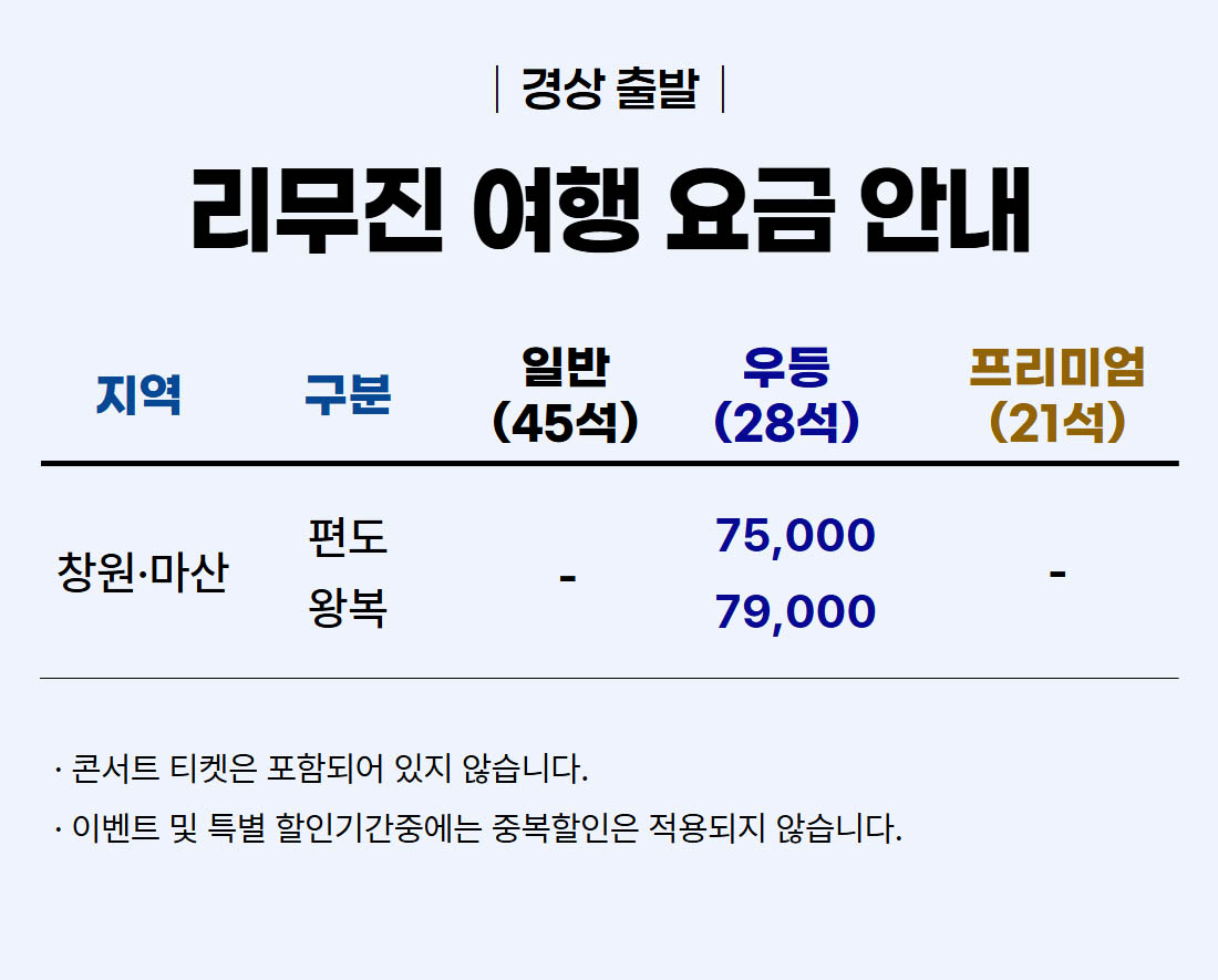 | ·불포함내역 | 콘서트 입장권, 개인 여행자 보험, 개인 비용 일체, 개별 식사, 개별 숙박, 가이드 미탑승, 쇼핑없음 |